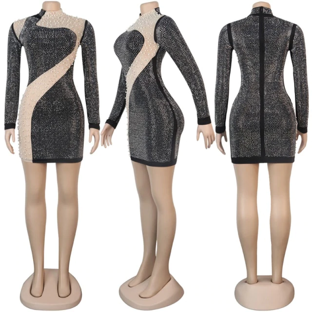 Silhouette: Sheath Season: Spring/Autumn Neckline: STAND Sleeve Style: Regular Decoration: Diamonds Style: Sexy & Club Dresses Length: Above Knee, Mini Material: Polyester Material: Spandex Material: Mesh Age: Ages 18-65 Years Old Model wearing a L Closure Type: zipper Sleeve Length(cm): Full Type: Regular Fabric Type: Knitting Gender: WOMEN Material Composition: Synthetic Fiber Waistline: empire Pattern Type: Patchwork Season: Autumn, Spring,Winter